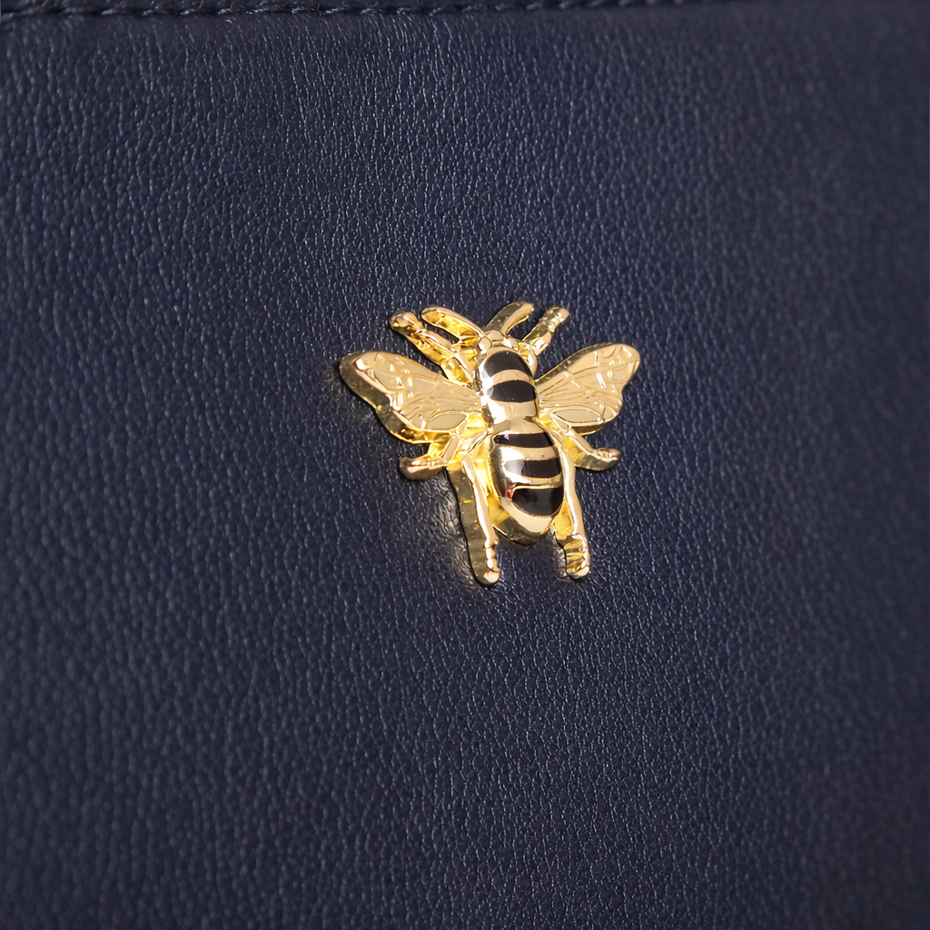 This timeless Alice Wheeler tote is ideal for travel or everyday use. Designed to sit comfortably on the shoulder, it features a textured faux leather front finished with the signature metal Bee, paired with a complementary faux suede back for a stylish contrast. The interior includes a zipped security pocket, perfect for keeping your phone, cards, or cash safe, along with a magnetic stud closure for easy access. Matching accessories are available to complete the look.