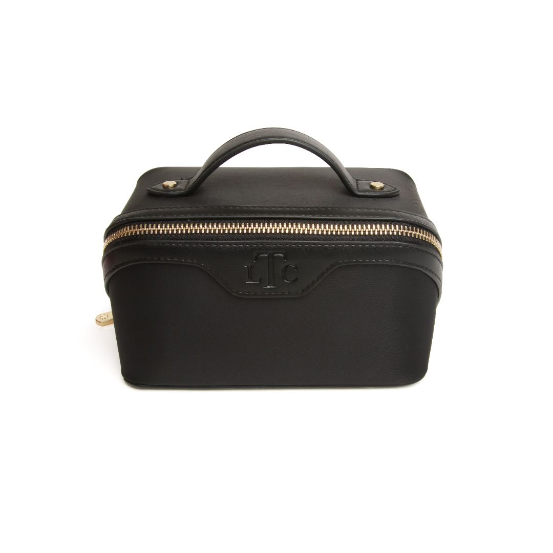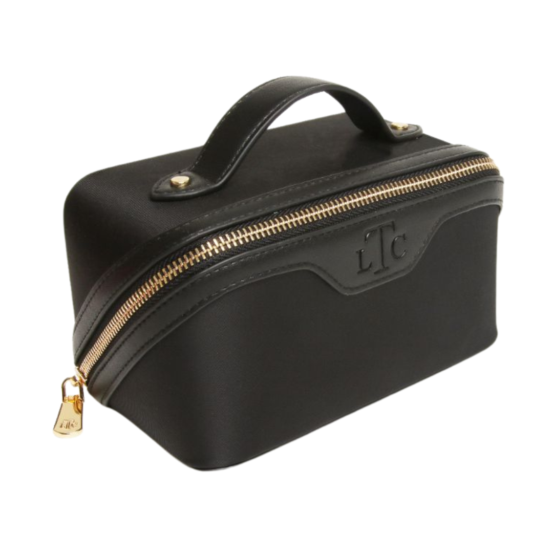 Elevate your beauty and makeup organization with a modern take on the mini classic train case. Crafted from premium vegan leather and high quality nylon with a two-tone design, accented with a gold zipper, this case makes a bold style statement.