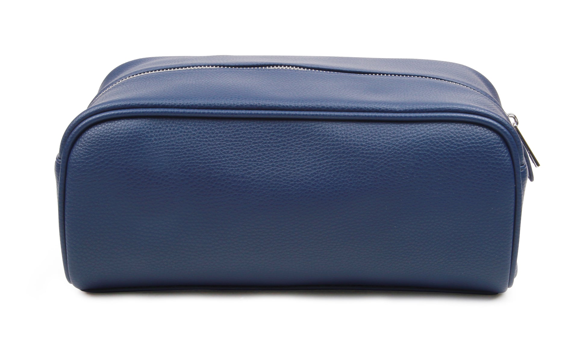 Navy luxury traditional shaped wash bag with one zipped compartment.